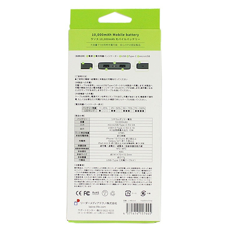 Lazos 10,000mAh モバイルバッテリー [L-MB10-B] ブラック USB Type-C