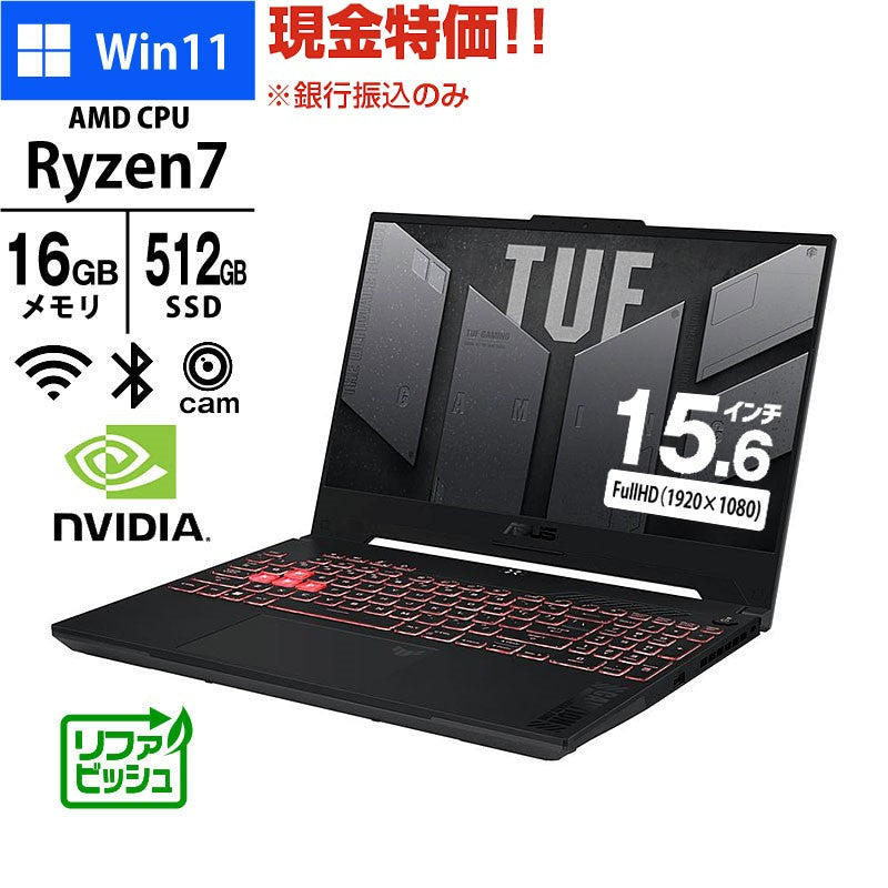 現金特価 ノートパソコン ASUS 15.6型 フルHD TUF Gaming A15 FA507NV-R7R4060 Ryzen7 7735HS メモリ16GB SSD512GB GeForce RTX4060 無線LAN Webカメラ テンキー Windows11 Home リファビッシュ PC 2024年モデル