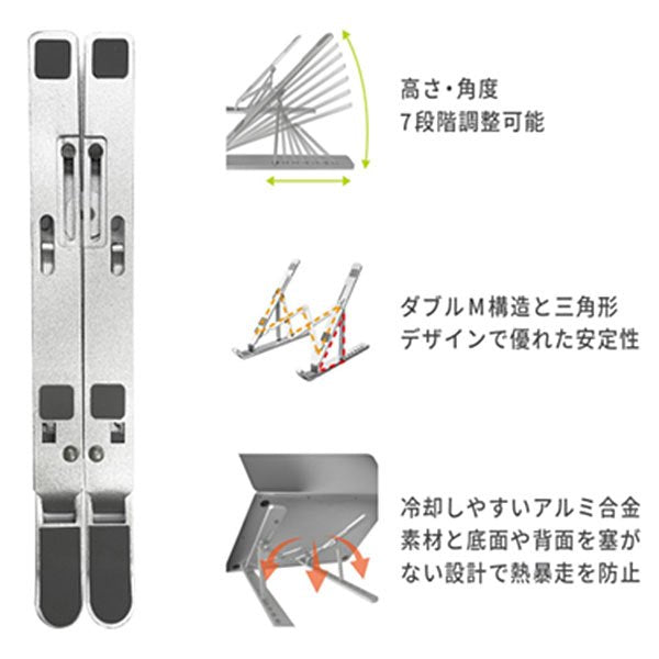 角度・高さ7段階で調節可能、放熱性の高いアルミ合金製