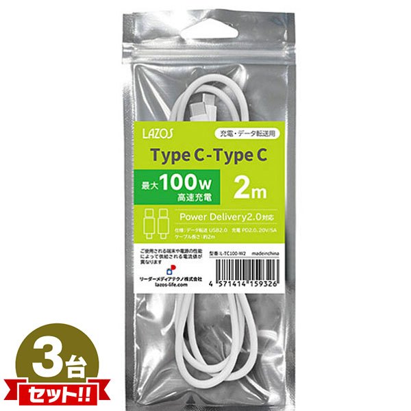 Lazos TypeC-TypeC ケーブル 100W 2m ホワイト L-TC100-W2 3点セット