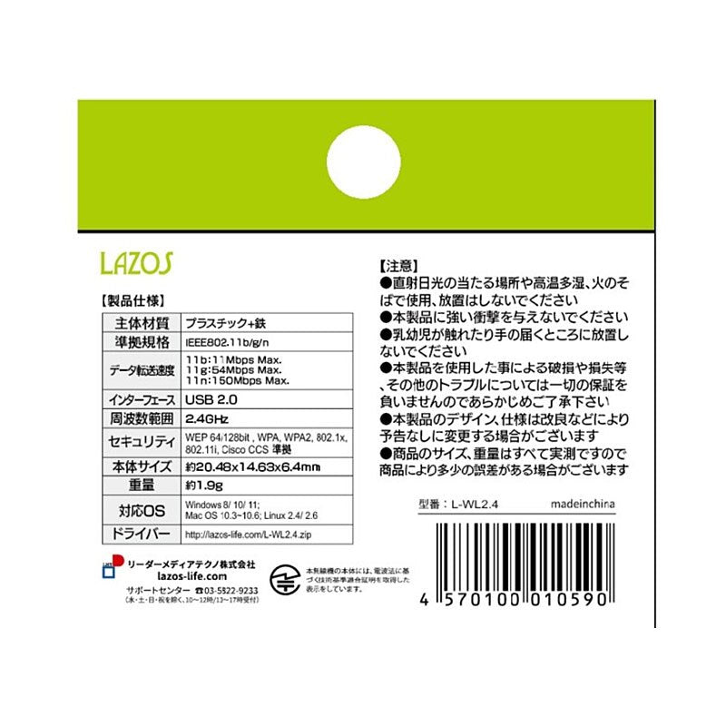 Lazos WiFi 11n対応 USB接続 無線LAN子機 2.4G [L-WL2.4] USB 2.0 接続