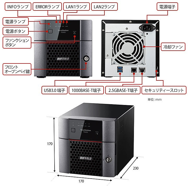 - 付属品:LANケーブル(2m)、電源ケーブル(1.6m)、3極-2極変換アダプター、フロントパネル開閉用鍵(2個)、ケーブル抜け防止バンド、取扱説明書、保証書、型番シール(3枚)