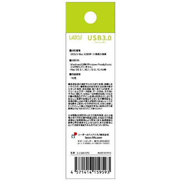 Lazos 64GB キャップ式USBフラッシュメモリ [L-US64-CPB] USB3.0接続 ブラック