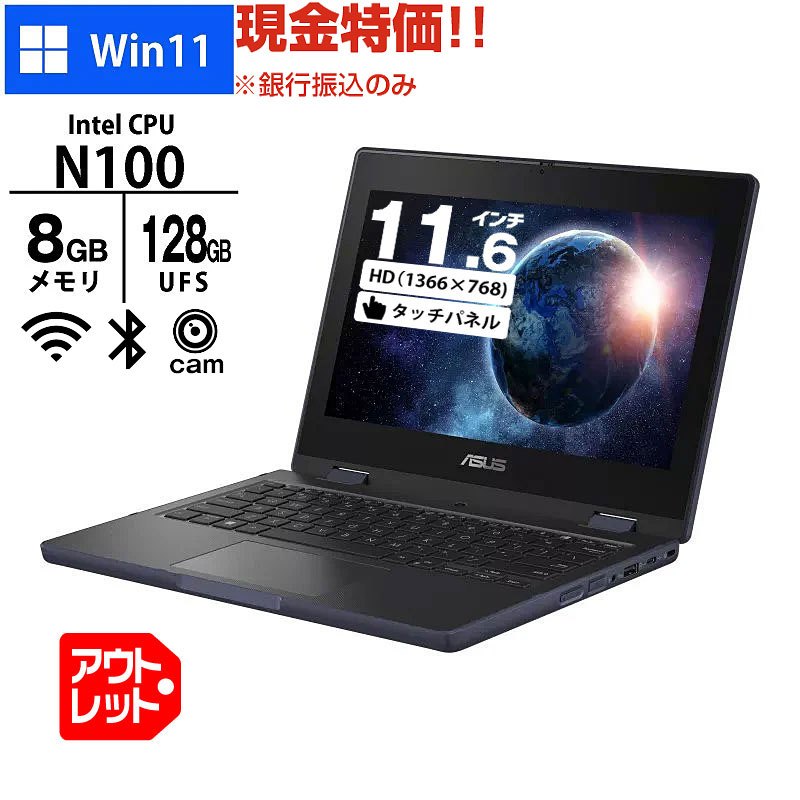 現金特価 ノートパソコン ASUS 11.6型 HD タッチパネル ASUS BR1104FG BR1104FGA-NS0010XA Intel N100 メモリ8GB UFS128GB 無線LAN Webカメラ Windows11 Pro Education アウトレット 2025年モデル ミネラルグレー